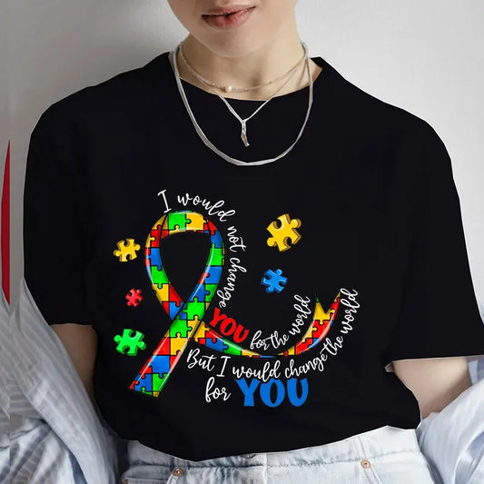 Women's T-shirt Casual Kawaii Clothing Autism Awareness Support Puzzle Print Tshirt Comfortable Casual Women Clothing Black Tops